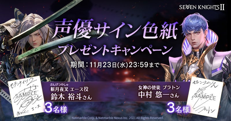 キャンペーン期間中に、『セブンナイツ2』公式Twitter(https://twitter.com/Sena2_JP)をフォローのうえ、キャンペーンツイートをリツイートしていただいた方の中から抽選で、鈴木裕斗さんと中村悠一さんの直筆サイン色紙を各3名様にプレゼントいたします。