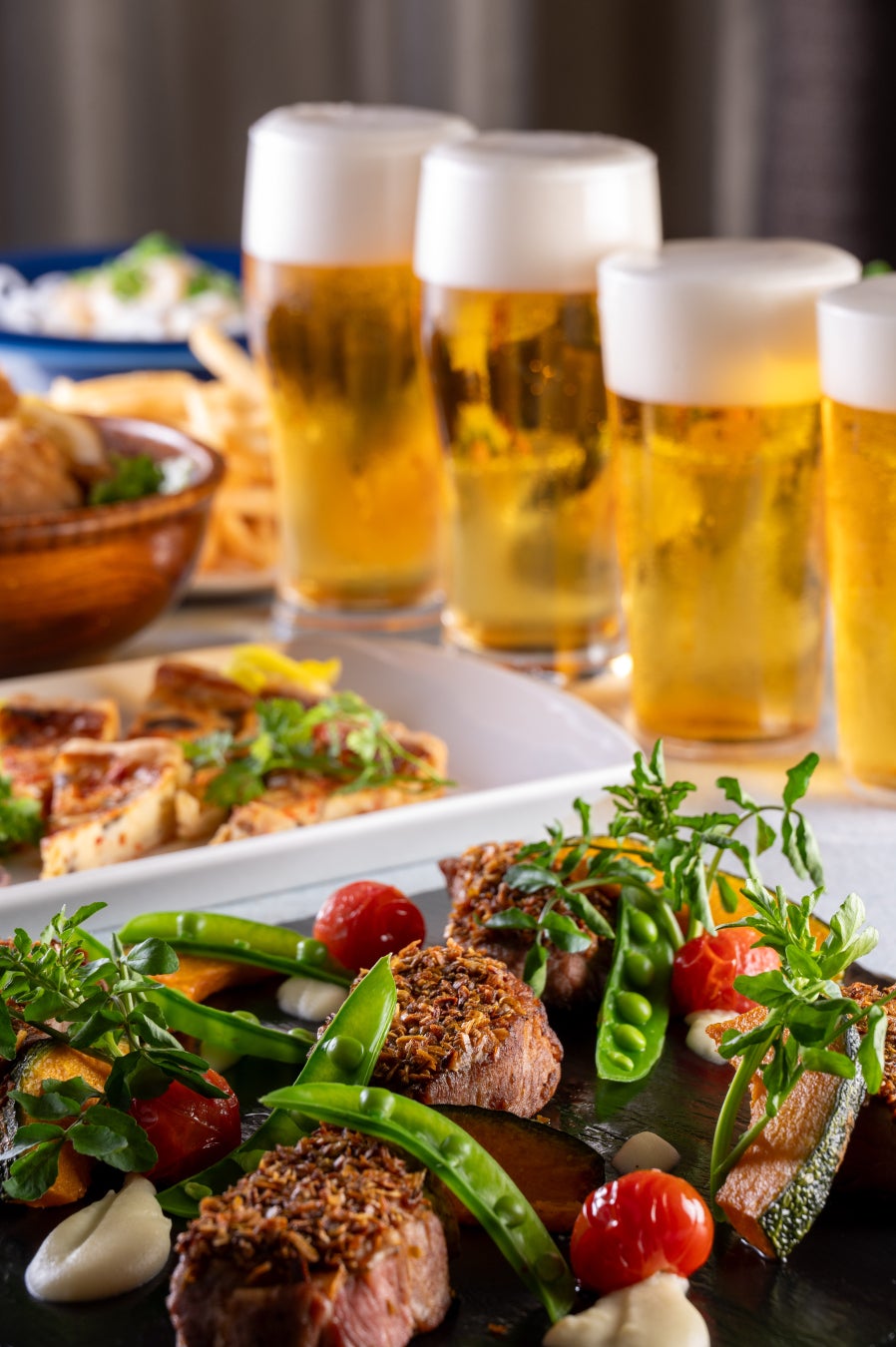 今年のビアフェアは、ビールを注ぐ時からお愉しみいただけるよう生ビールをトルネードディスペンサーで3種類ご用意。そのほか、レモンサワーやブラックニッカハイボール、ワインなどアルコール飲料は全8種ラインアップ。