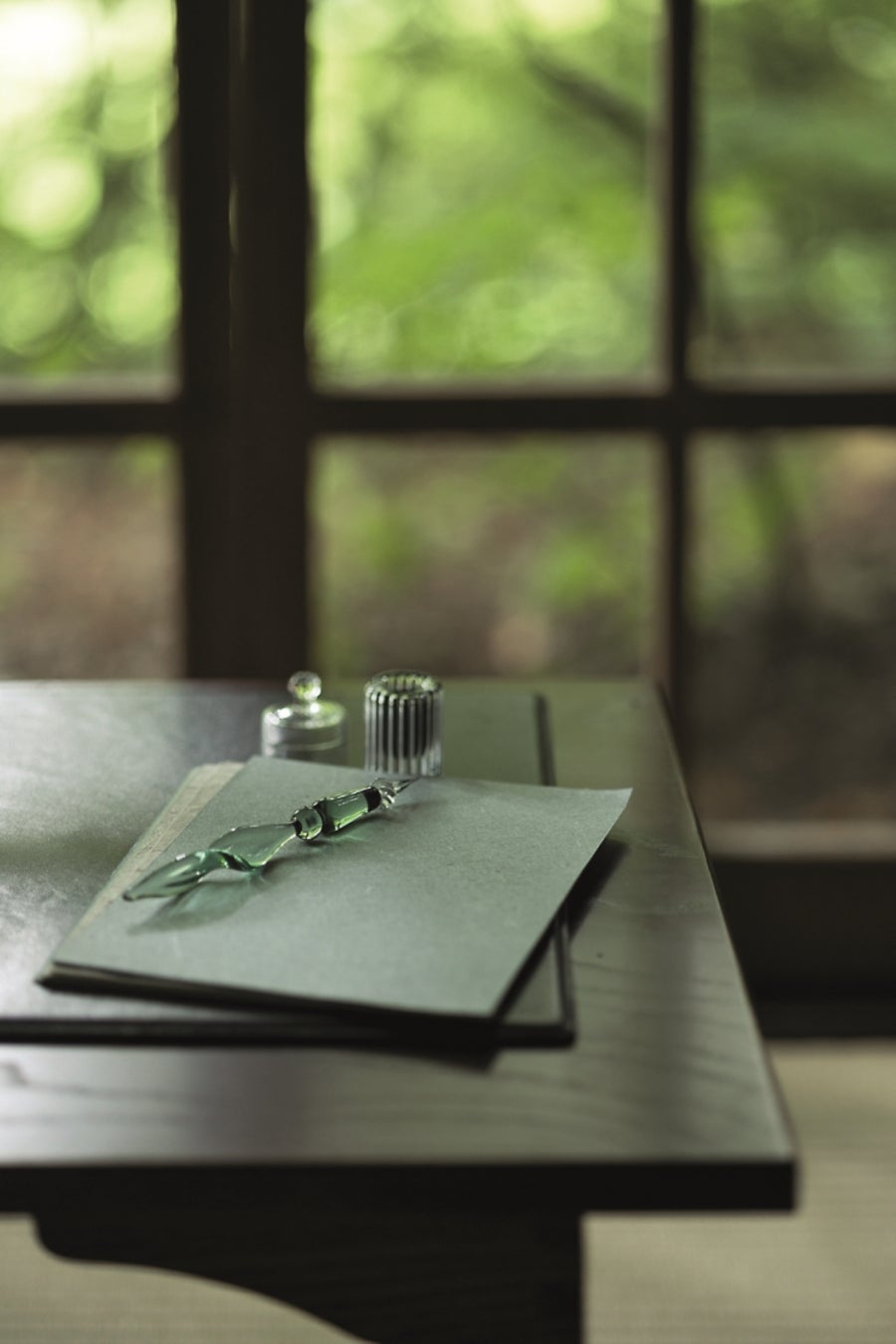 集落内にある、四季の移ろいを感じられる大きな窓が特徴の茶屋で、大切な人や自分に宛てた手紙をしたためます。集落の植生をモチーフにしたガラスペンと伝統工芸品の内山和紙、クロモジの香りのインクを使い、旅の思い出を形に残します。