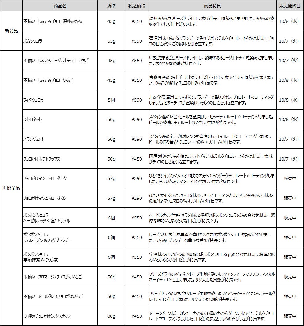 その他にも、昨年に引き続き「ボンボンショコラ」、「チョコがけポテトチップス」などの商品も含め10月中に16種のチョコレート菓子が揃う予定です。さらに、今秋冬では全約45種のチョコレート菓子の販売を予定しています。手軽におやつとして食べられるようなものから、ちょっとした特別な日にも食べられるものまで、さまざまな製法や素材の組み合わせ、食感が楽しめる品揃えで商品を販売してまいります。
