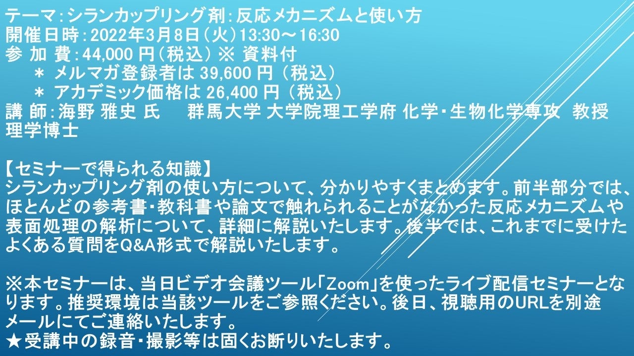 先端技術情報や市場情報を提供している(株)シーエムシー・リサーチ(千代田区神田錦町: https://cmcre.com/ )では、 各種材料・化学品などの市場動向・技術動向のセミナーや書籍発行を行っておりますが、 このたび「シランカップリング剤:反応メカニズムと使い方」と題するセミナーを、 講師に海野 雅史 氏 群馬大学 大学院理工学府 化学・生物化学専攻 教授 理学博士)をお迎えし、2022年3月8日(火)13:30より、 ZOOMを利用したライブ配信で開催いたします。 受講料は、 一般:44,000 円(税込)、 弊社メルマガ会員:39,600 円 (税込)、 アカデミック価格は26,400 円 (税込)となっております(資料付)。