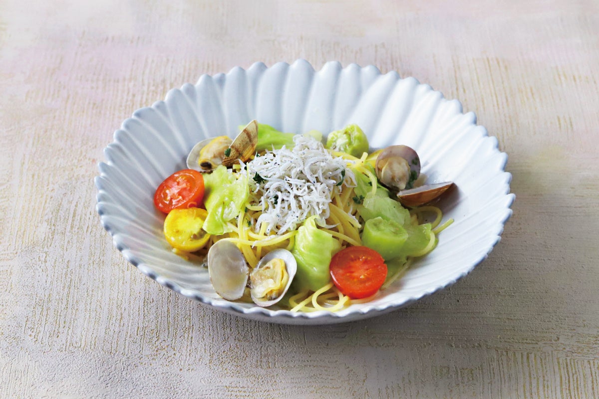 キャベツの甘みと、色鮮やかなトマト、淡路産しらす、あさりを合わせたオイルパスタです。