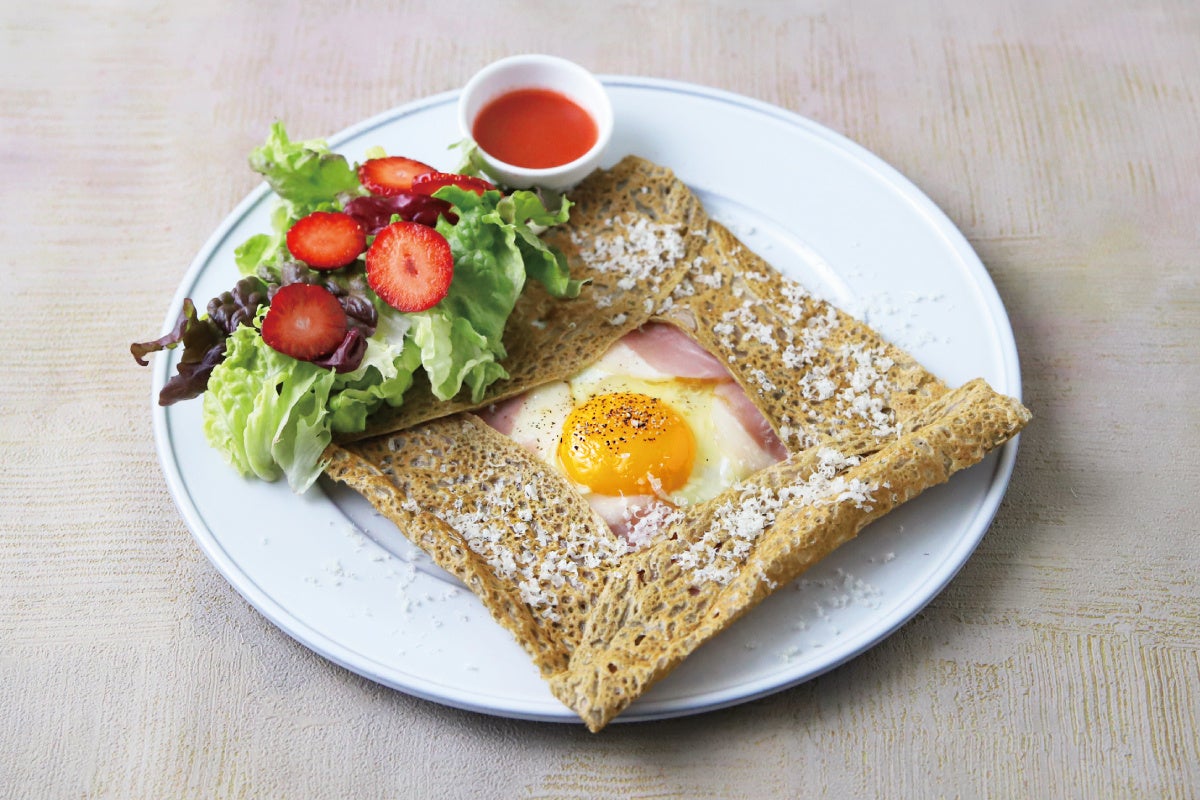 神戸ポークハムと播州赤たまご、チーズが入ったシンプルなガレットコンプレ。自家製いちごドレッシングをサラダにかけてお召し上がりください。