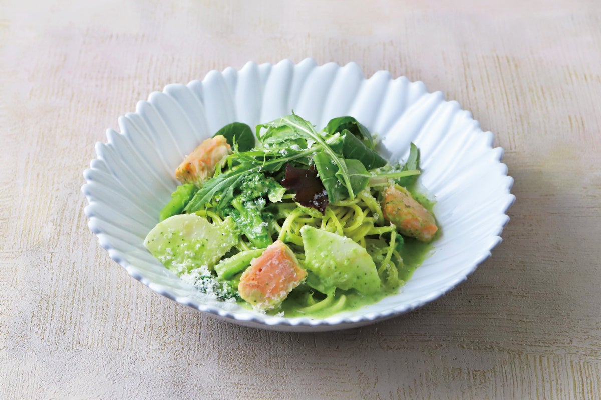 菜の花に小松菜のピューレを加え色鮮やかなクリームパスタに仕上げました。トラウトサーモンをほぐしていっしょにお召し上がりください。