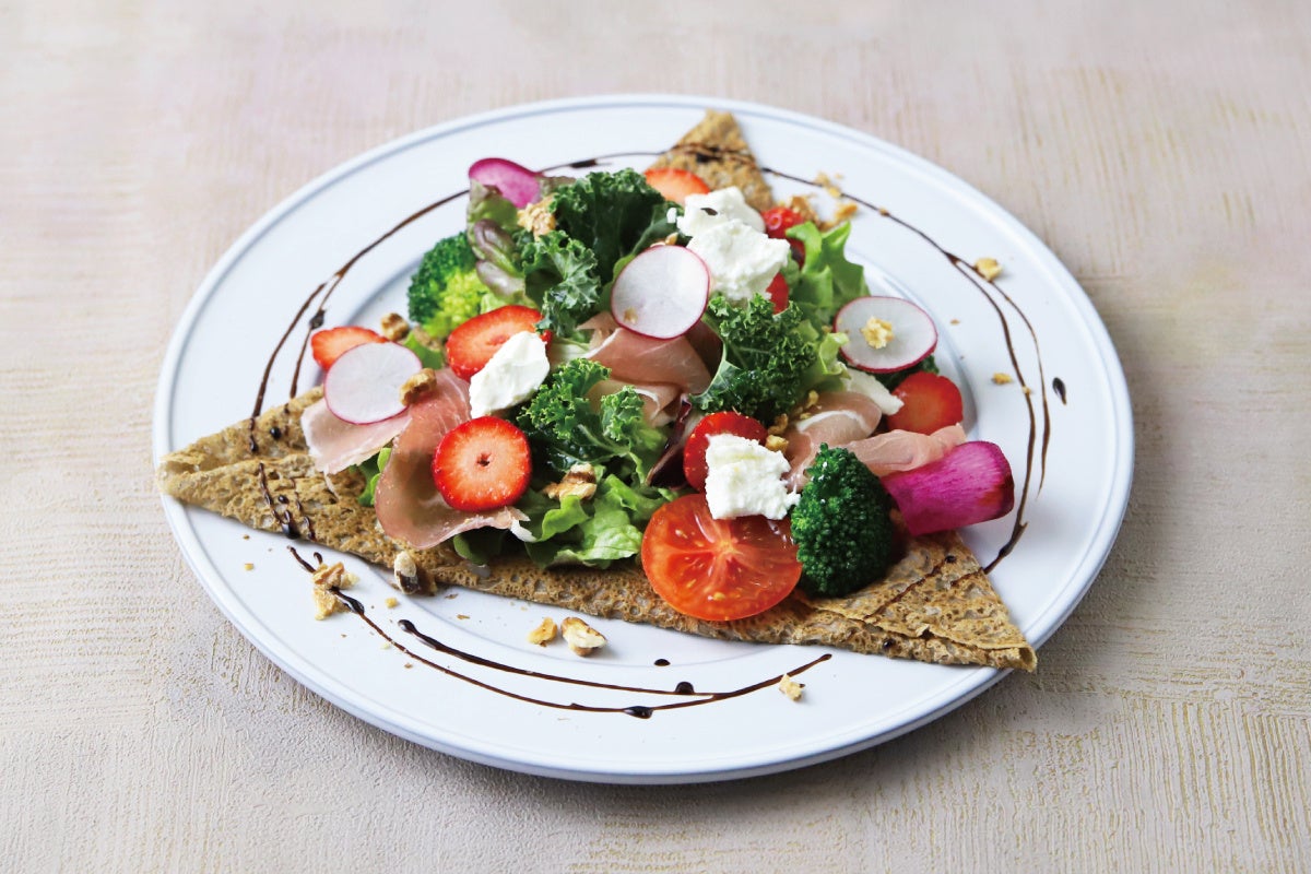 甘酸っぱいいちごと生ハム、リコッタチーズの相性抜群の組み合わせに、彩り鮮やかな野菜を合わせたサラダガレット。バルサミコソースと一緒にお召し上がりください。