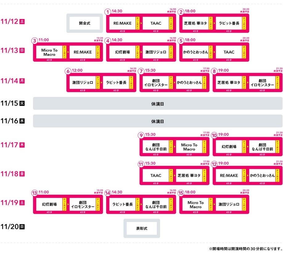 参加劇団:かのうとおっさん(大阪) / 劇団イロモンスター(大阪) / 劇団なんば千日前(大阪) / 激団リジョロ(東京) / 幻灯劇場(京都) / 芝居処 華ヨタ(大阪) / TAAC(東京) / Micro To Macro(大阪) / ラビット番長(東京) / RE:MAKE(大阪)