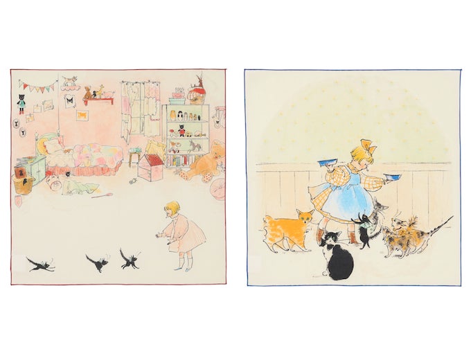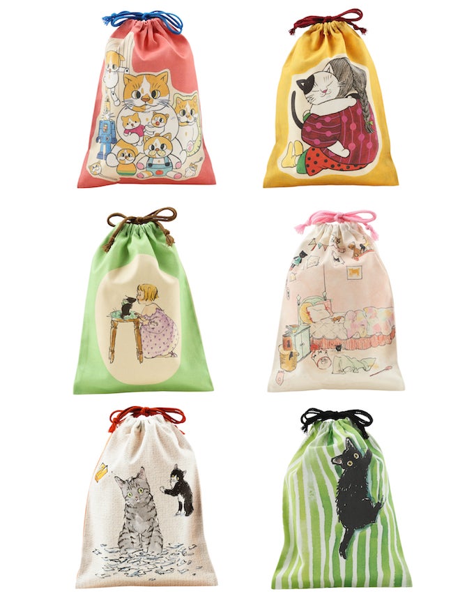 「こねこのトトはおるすばん」「猫かるた」「ねこの5ふんご」巾着(全6種)