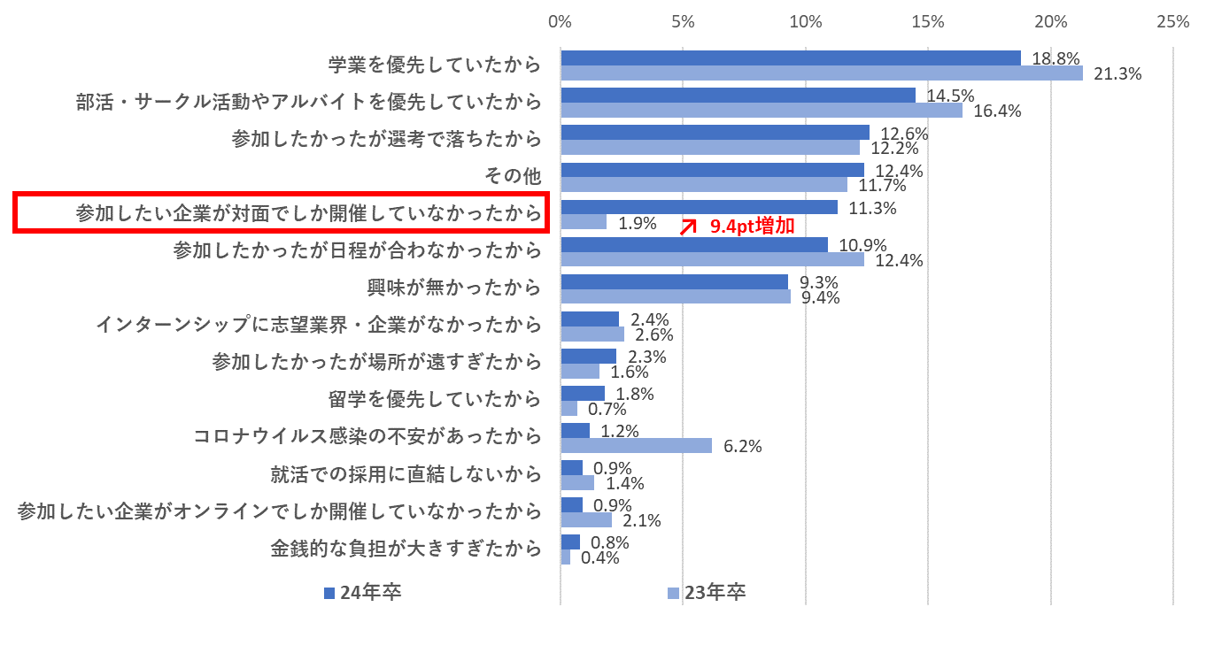 インターンシップに参加しなかった学生に理由を聞いたところ、「学業を優先していたから」(18.8%)や「部活・サークル活動やアルバイトを優先していたから」(14.5%)などが挙がり、インターンシップの代わりに学生時代にしか経験できない活動に注力していることがわかった。前年比で最も増えたのは「参加したい企業が対面でしか開催していなかったから」で、前年比9.4pt増の11.3%だった。開催地が遠方だったなどの何かしらの事情で、学生が参加できなかった、という状況が推測できる。【図3】