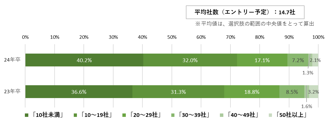 3月1日以降の平均エントリー予定社数は14.7社。インターンシップ参加社数が多い学生ほどエントリー予定社数も増加傾向に
