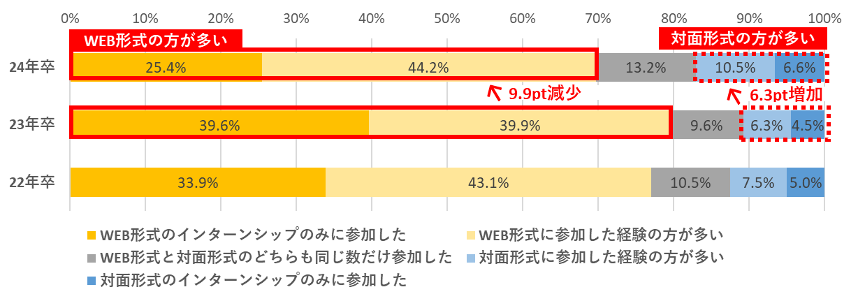 これまで参加したインターンシップの開催形式は、「WEB形式に参加した方が多い」の回答が69.6%となったが、前年比では9.9pt減少した。一方、「対面形式に参加したほうが多い」は17.1%で、前年比では6.3pt増加した。2024年卒に関しては、コロナ禍の行動制限が少なかったこともあり、インターンシップも対面が増えていると考えられる。【図2】