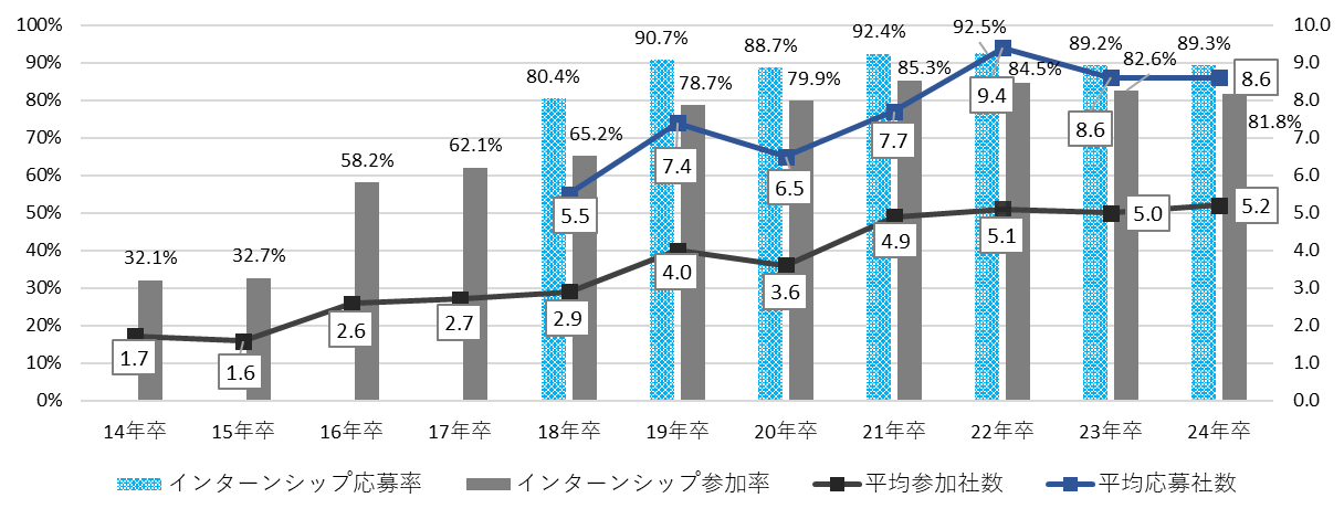 【図1】インターンシップ応募・参加割合と平均応募社数・参加社数の推移