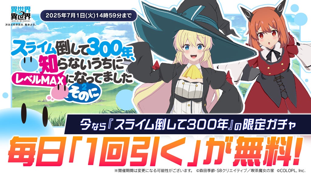 株式会社コロプラ(代表取締役社長 上席執行役員 CEO:宮本貴志、本社:東京都港区、以下「コロプラ」)は、スマートフォン&PCでもっと異世界を楽しむゲーム『異世界∞異世界』(いせかいいせかい)にて、本日2025年6月16日(月)より人気アニメ作品「スライム倒して300年、知らないうちにレベルMAXになってました 〜そのに〜」(以下、「スライム倒して300年」)とキャラクターたちが登場していることをお知らせいたします。