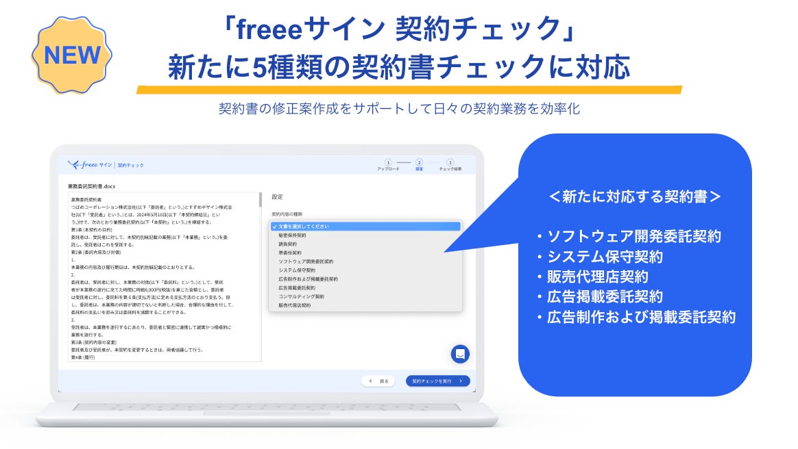 フリー株式会社(本社:東京都品川区、CEO:佐々木大輔、以下「freee」)は、弁護士監修AIによる契約書のリスクチェックが可能な「freeeサイン 契約チェック」において、新たに5種類の契約書のチェックに対応を開始しました。