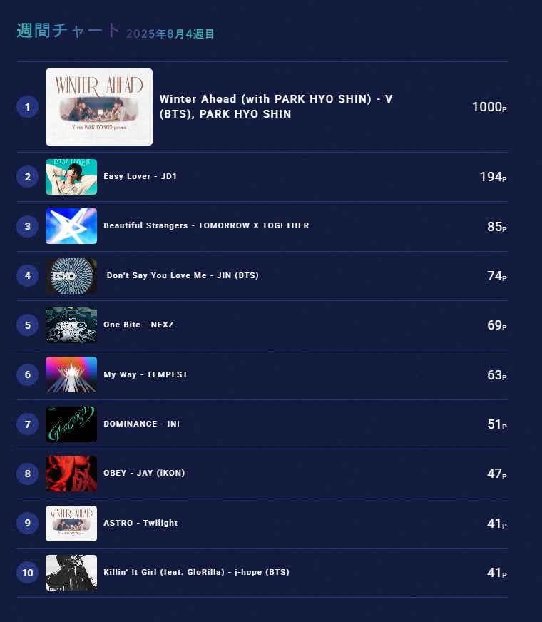 『K-STAR CHART presents POP-K TOP10 Friday』8月22日(金)の放送回では、BTSのVとパク・ヒョシンによる「Winter Ahead (with PARK HYO SHIN)」が30回目の1位となり、番組内でもオンエアされました。