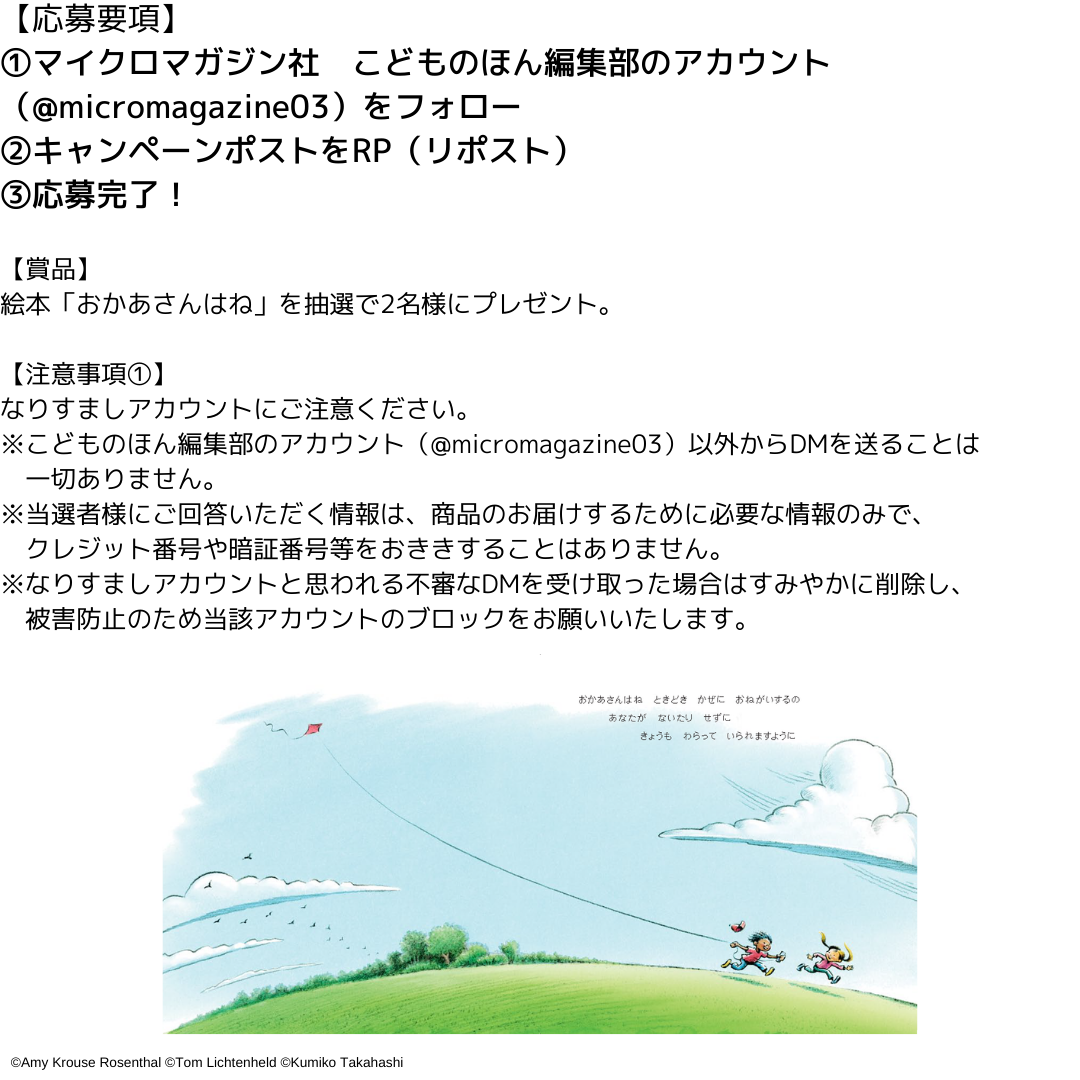 抽選で2名様に絵本『おかあさんはね』をプレゼントいたします。