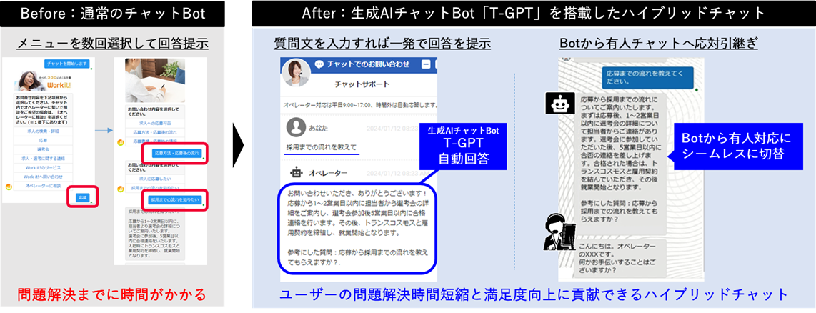 これまでのチャットボットではシナリオ選択による操作負担や問い合わせ中の途中離脱が課題でしたが、「T-GPT」を利用することで、自然文による質問に対してすぐに適切な回答を提示できるようになります。また複数の業務ナレッジ(FAQ等)の確認が必要な問い合わせに対しても、「T-GPT」は複数の業務ナレッジを要約して回答できるためエンドユーザーの解決時間短縮と満足度向上に貢献します。