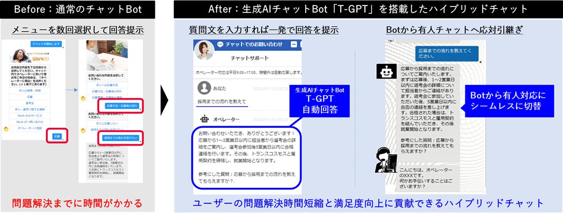 チャットボット運用面でも従来のメンテナンスでは網羅的なチャットボット回答シナリオ整備が課題でしたが、「T-GPT」は生成AI用の業務ナレッジ情報を更新するのみで最新の情報を元にした回答が可能となり、継続的なBot解決率向上と運用コスト削減が可能になります。またこれらの生成AIチャットBot機能はシームレスに有人チャットに応対を引き継ぐことができ、企業はエンドユーザーの体験を阻害することなく一貫したサポート体験を提供することができます。