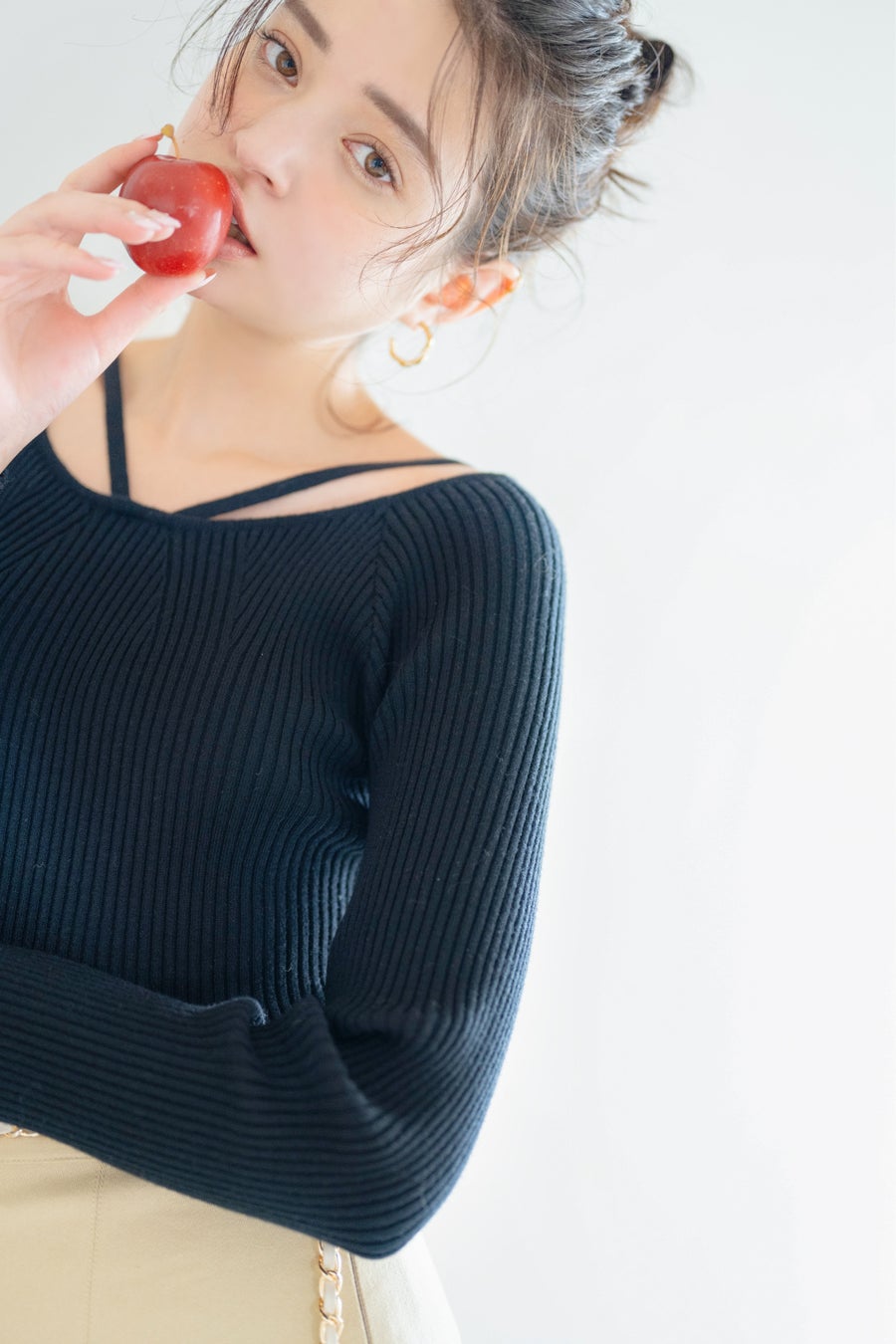 オフショルとハイネックニットをレイヤードしたようなヘルシーに肌見せが出来るニット。