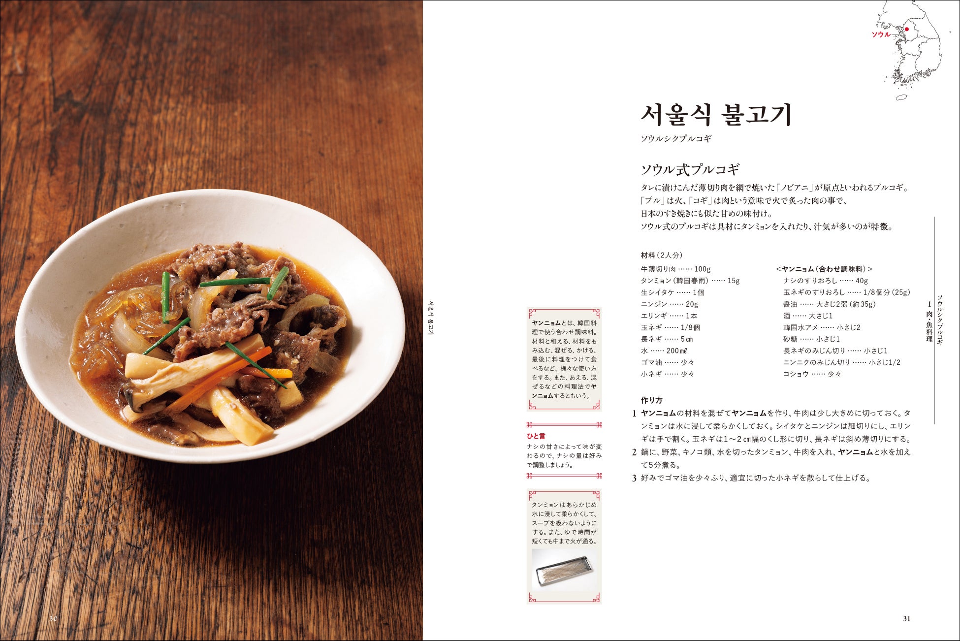 わかりやすく、肉、魚のメイン料理、スープ、チゲの鍋物など料理別に章をまとめ、四季折々の食材を使って韓国の一年の味を載せています。