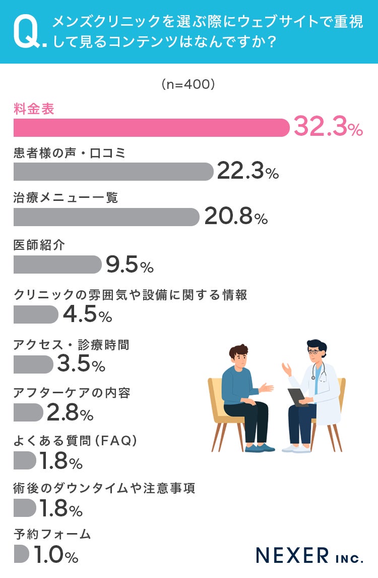 さらにメンズクリニックを選ぶ際に、ウェブサイトで重視して見るコンテンツを選んでもらいました。