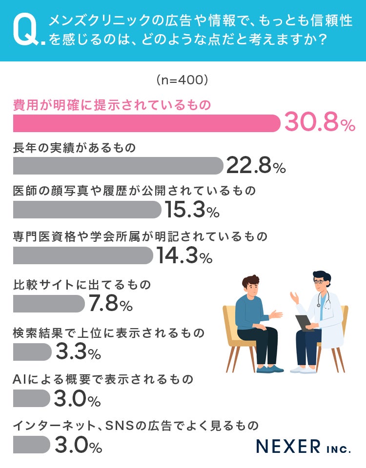 続いてメンズクリニックの広告や情報で、もっとも信頼性を感じるのはどのような点だと考えるのか聞いてみました。