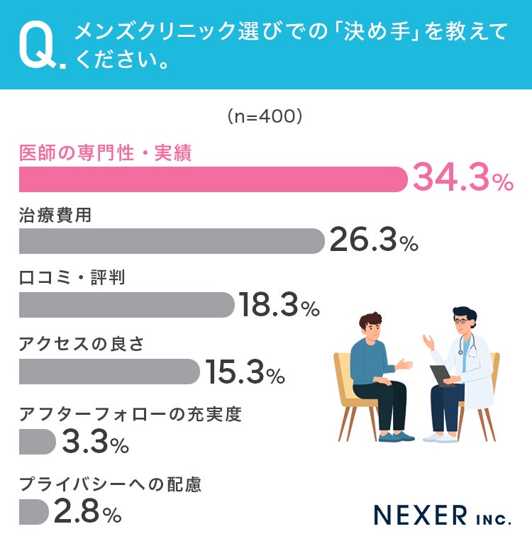 ■メンズクリニック選びの決め手、34.3%が「医師の専門性・実績」と回答