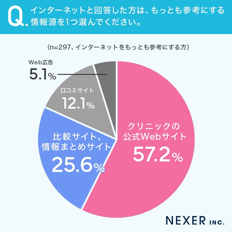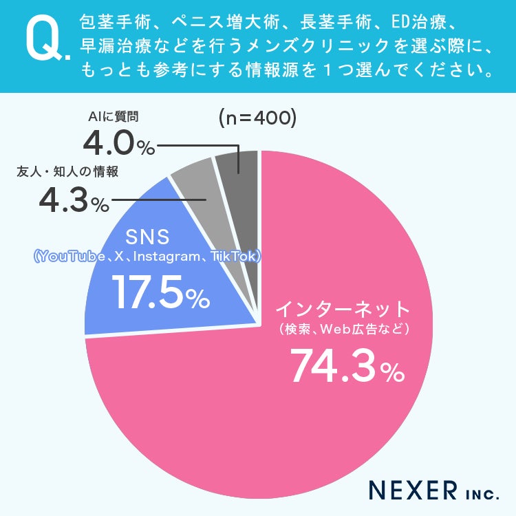 質問1:包茎手術、ペニス増大術、長茎手術、ED治療、早漏治療などを行うメンズクリニック選び選ぶ際に、もっとも参考にする情報源を1つ選んでください。