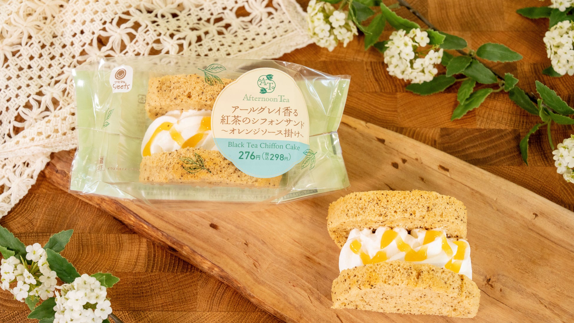 【内容】ふわふわ食感の紅茶シフォンで紅茶カスタードとホイップクリームをサンドしました。オレンジソースがアクセントです。