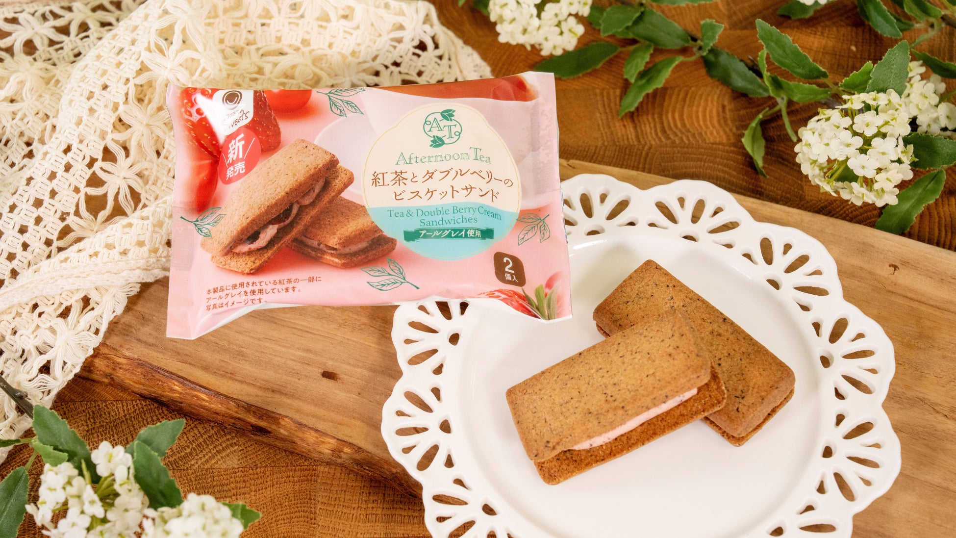 【内容】サックサクの紅茶ビスケットにダブルベリー入り紅茶クリームをサンドしました。