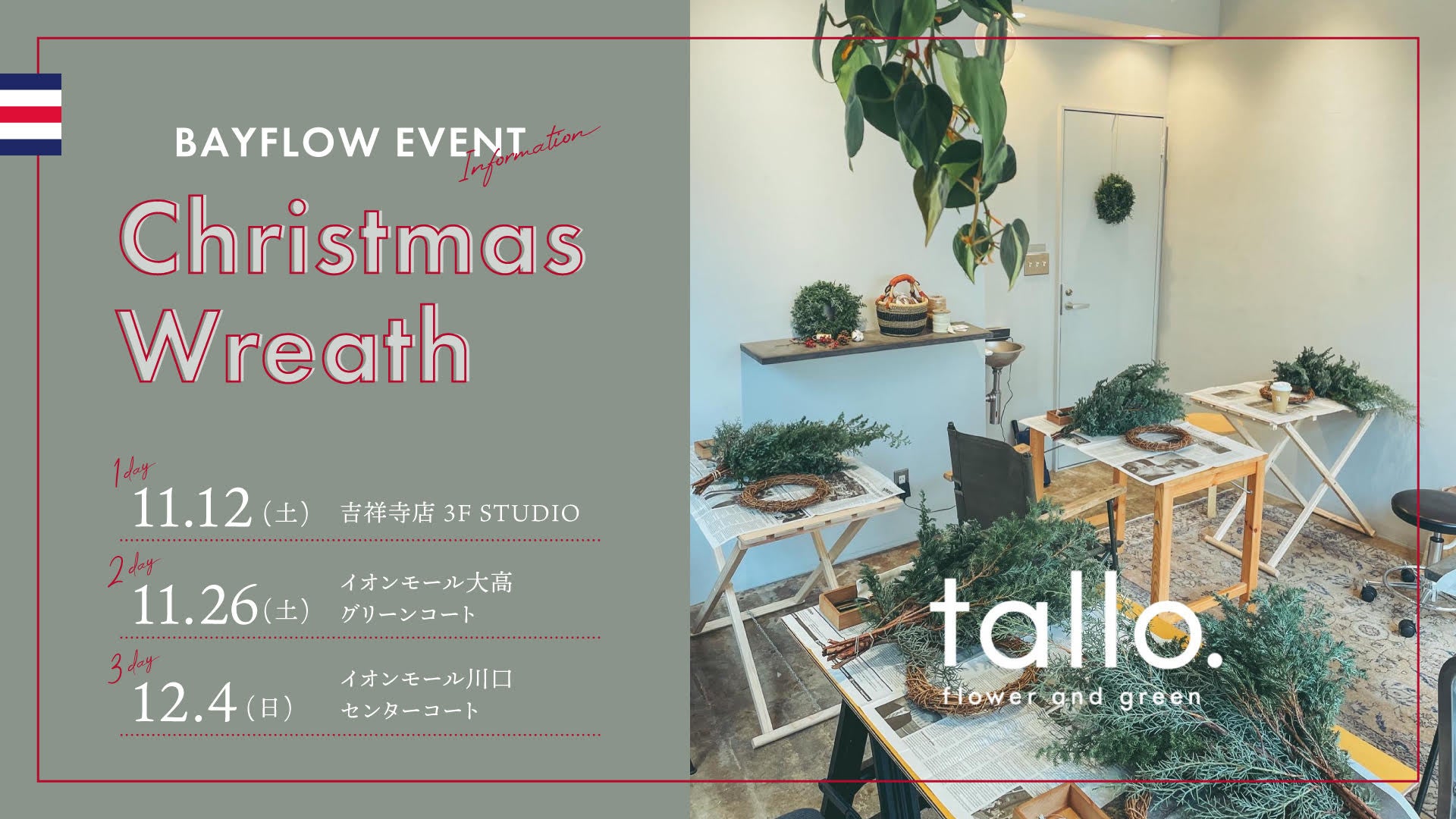 さらにポップアップコーナーを展開する3店舗では、神奈川県鎌倉市のフラワーショップ「tallo.(タロ)」のフローリスト・橘川知美(きつかわともみ)さんをお招きし、フレッシュな花材でクリスマスリースを手作りするワークショップも開催します。フレッシュグリーンの冬の香りに包まれて、家族の健康や幸せを願いながら、自分好みにお作りいただけます。