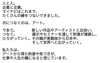 人と人、企業と企業など、半世紀にわたって多くの縁をつないできたマイナビが、『マイナビアートスクエア』を通して次につなぐのは、アートと人、アートと企業との出会い。新しい作品やアーティスト、その中にある“アイディア”と「であう。」、作品展示やセミナーを通して“刺激”を「つなぐ。」、その輪を東銀座から日本中、そして“世界へ”「ひろがっていく。」。そんな施設を目指しています。