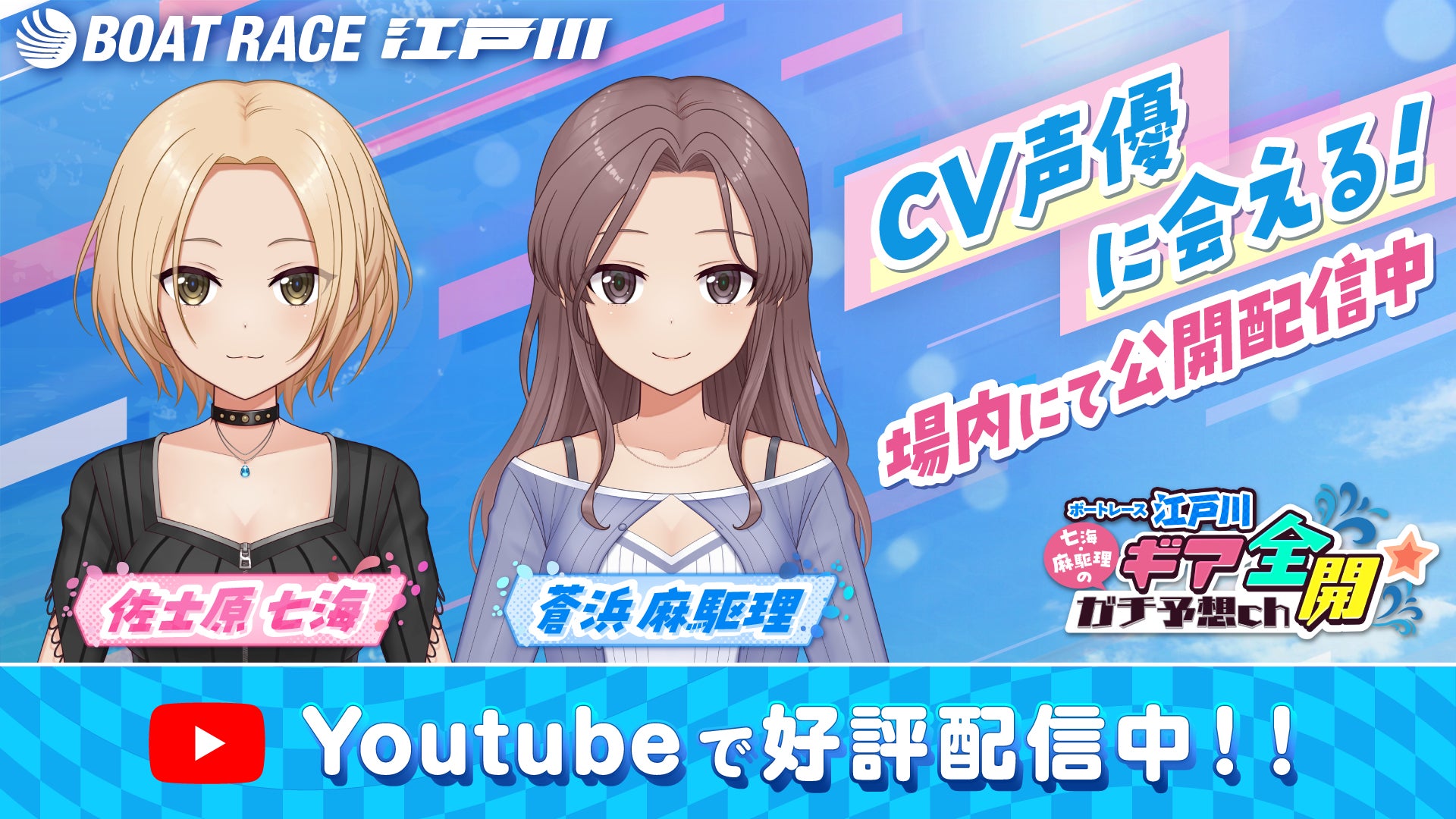 コラボ開催に先駆けて、アクトレスである「佐士原 七海(CV:結城 飛鳥)」と「蒼浜 麻駆理(CV:都丸 ちよ)」の2人が、BOAT RACE江戸川公式YouTubeチャンネル「七海・麻駆理のギア全開★ガチ予想ch」の公式VTuberとして就任いたしました。