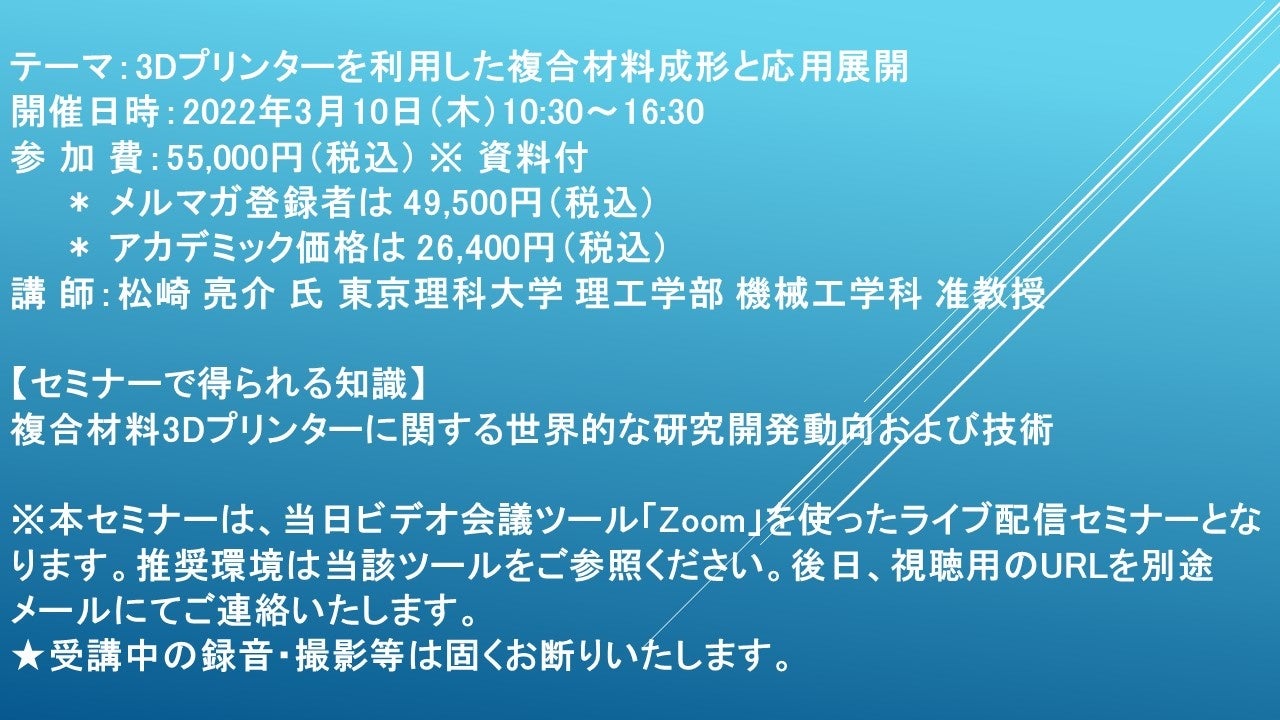 先端技術情報や市場情報を提供している(株)シーエムシー・リサーチ(千代田区神田錦町: https://cmcre.com/ )では、 各種材料・化学品などの市場動向・技術動向のセミナーや書籍発行を行っておりますが、 このたび「3Dプリンターを利用した複合材料成形と応用展開」と題するセミナーを、 講師に松崎 亮介 氏 東京理科大学 理工学部 機械工学科 准教授)をお迎えし、2022年3月10日(木)10:30より、 ZOOMを利用したライブ配信で開催いたします。 受講料は、 一般:55,000円(税込)、 弊社メルマガ会員:49,500円(税込)、 アカデミック価格は26,400円(税込)となっております(資料付)。