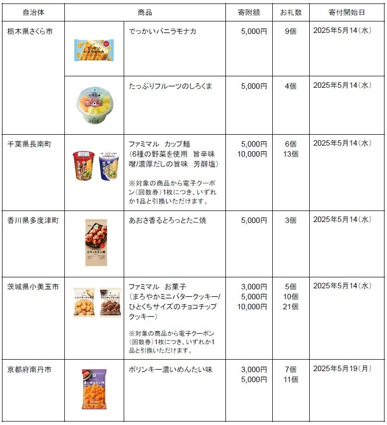 株式会社ファミリーマート(本社:東京都港区、代表取締役社長:細見研介)は、継続して取り組んでいる5つのキーワードの「たのしいおトク」「『あなた』のうれしい」の一環として、「お礼品がすぐに全国の店舗で引換可能」な「ファミマふるさと納税」から、新たに「茨城県小美玉市」、「栃木県さくら市」、「香川県多度津町」、「千葉県長南町」、「京都府南丹市」の5自治体8商品を、2025年5月14日(水)10時から順次追加いたします。