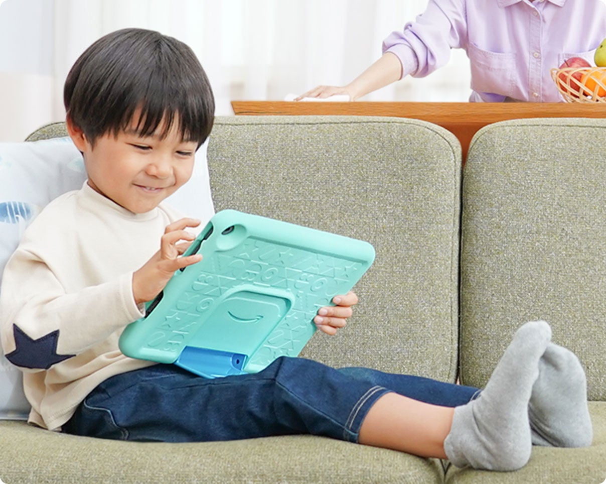 Fire HD 10 キッズプロは、最新のFire HD 10タブレットに加え、小学生向けにコンテンツの選択肢がより充実した Amazon Kids+ の1年間のサブスクリプション( https://www.amazon.co.jp/kidsplus )と持ち運びやすいスリムカバーなど、子どもが使い始めるために必要なものが揃ったタブレットです。さらに、2年間の限定保証*2と2色のカバー、そしてカバーに貼り付けることができる、別売りの日本向けオリジナルタブレットケースステッカーもお選びいただけます。