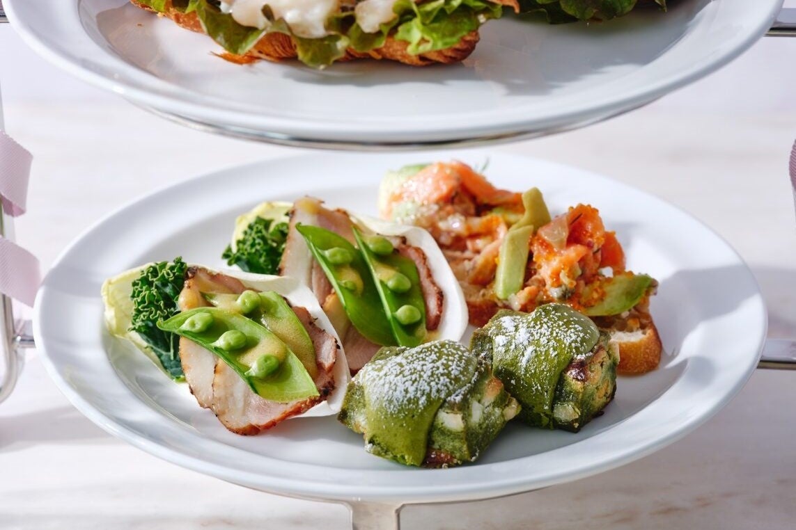 また下段のセイボリーには、チコリの上にスモークした鴨と季節野菜を乗せたサラダ、抹茶のスコーン、サーモンとアボカドのタルティーヌのラインナップが並びます。