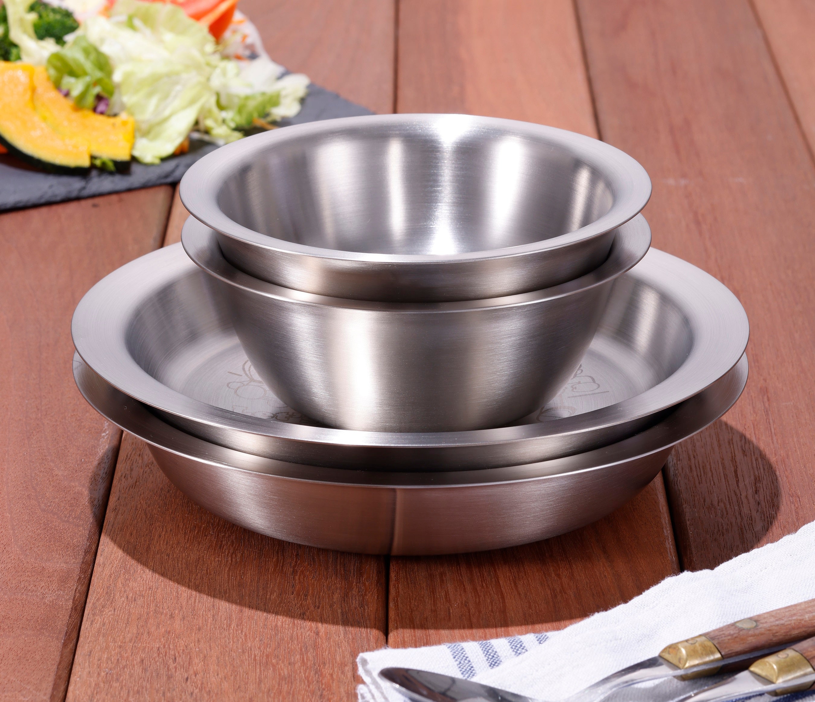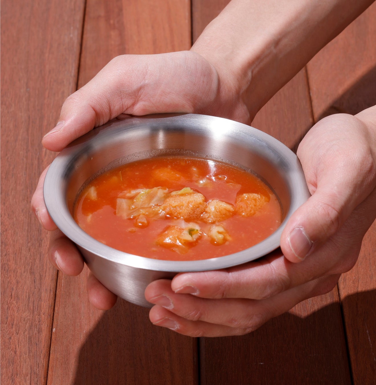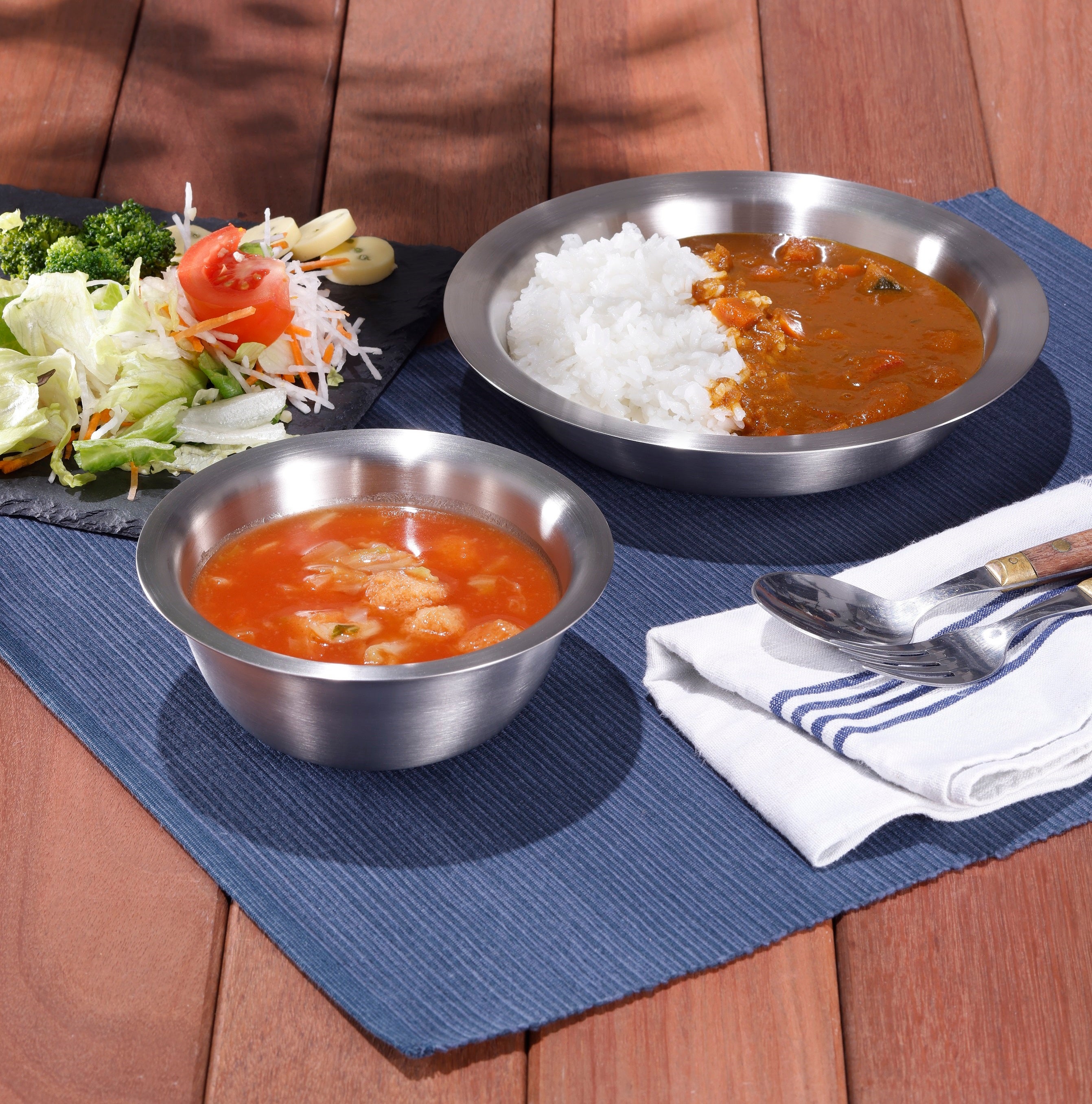 1904年にドイツで創業した魔法びんブランド「サーモス」の真空断熱ステンレスプレートとボウルをベースに製作しました。これは二重構造にしたプレートとボウルの中空部分を真空にすることで、内側と外側の熱移動を遮断したもの。これにより噐に熱々のスープやシチューを盛っても外側まで熱が伝わらず、素手で持つことができます。