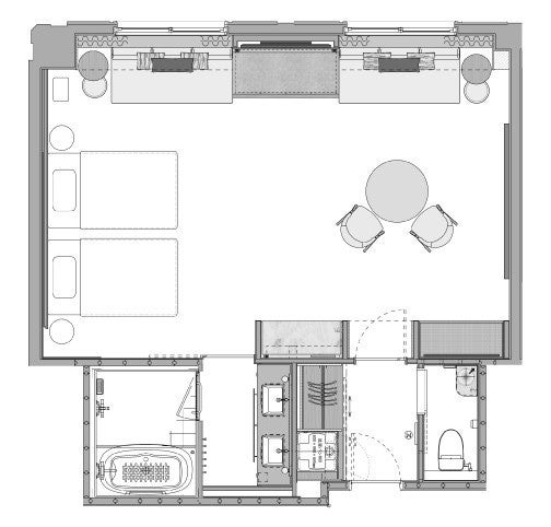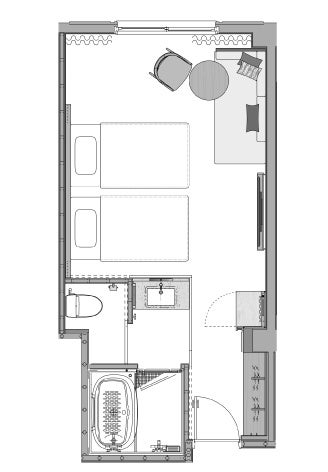 コンパクトながらも、くつろぎの質にこだわった客室です。お部屋の一角に開放的な洗面スペースを設け、二枚の引き戸を閉めればプライバシーも確保。複数名の滞在でも、ゆったりとお過ごしいただけます。