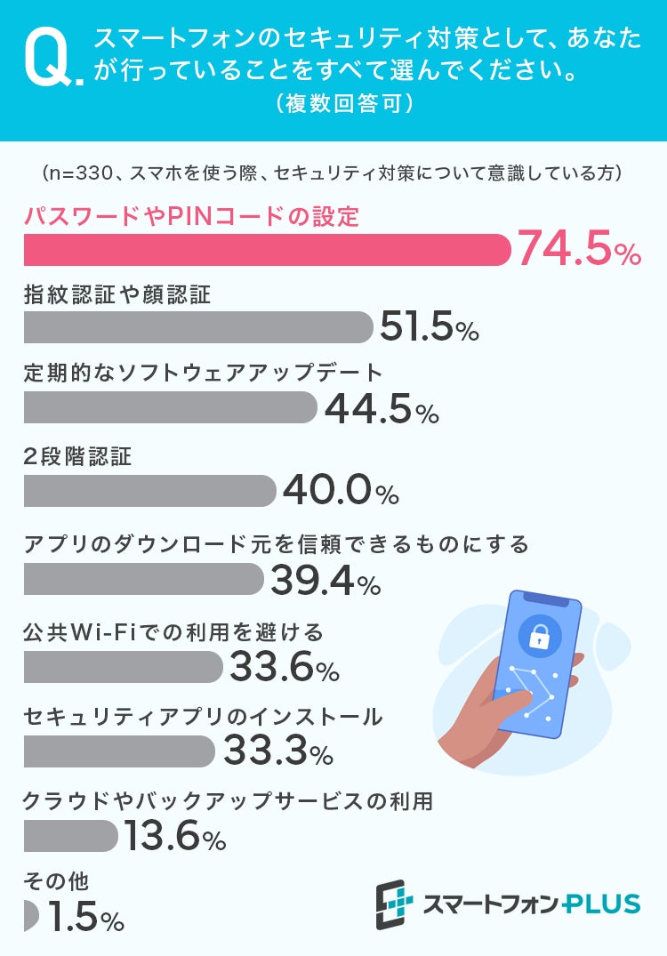 もっとも多かったのは「パスワードやPINコードの設定」で、74.5%の方が実施しているようです。