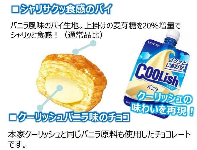 - バニラ風味のパイ生地には麦芽糖を通常品比20%増量してシャリサクッ食感、チョコはクーリッシュと同じ原料を使用しバニラのおいしさが楽しめます。冷やすと、さらに新感覚で楽しめますのでお試しください!(目安は冷凍庫に1時間)