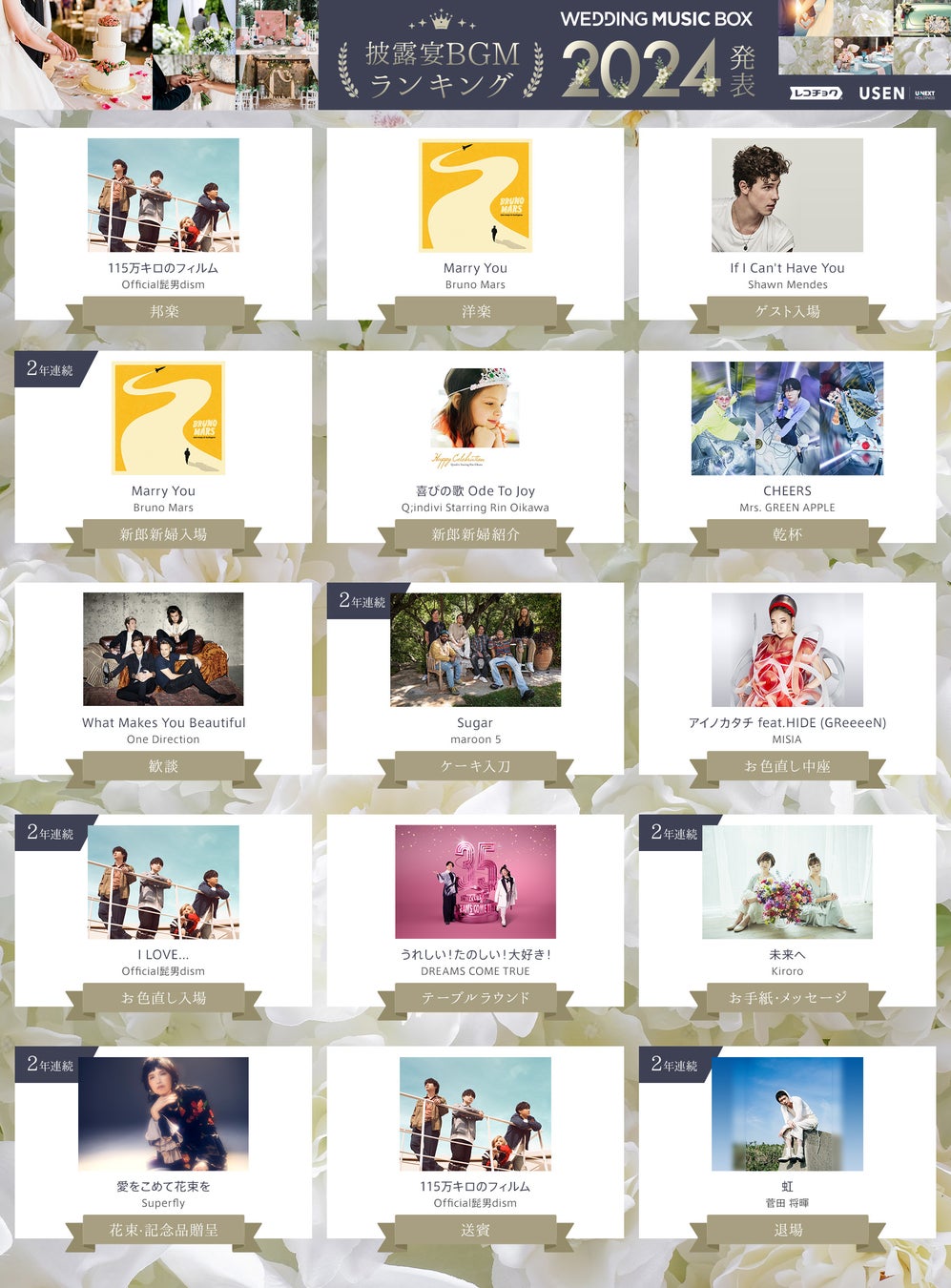 USEN&U-NEXT GROUPの株式会社USEN(本社:東京都品川区、代表取締役社長:貴舩 靖彦)と株式会社レコチョク(本社:東京都渋谷区、代表取締役社長:板橋 徹)は、協業で提供する披露宴BGMサービスパッケージ『WEDDING MUSIC BOX』で今年1年間、最も利用された楽曲の利用数を集計し、「披露宴BGMランキング2024 ~by WEDDING MUSIC BOX~」の<邦楽・洋楽 各トップ10><新郎新婦入場、乾杯、ケーキ入刀、お手紙・メッセージなどシーン別トップ3>を本日、2024年11月20日に発表したことをお知らせします。