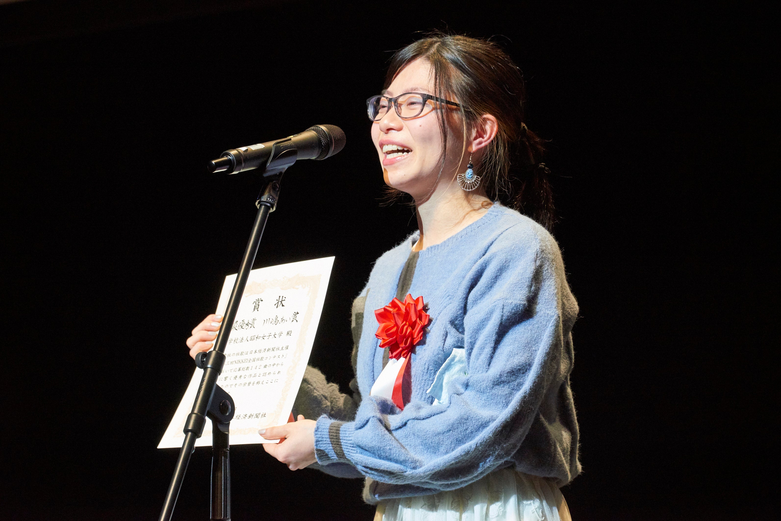 社歌を起点として社内外のコミュニケーション活性化を実現していただくべく開催された「第三回 NIKKEI全国社歌コンテスト」。その決勝戦では一般投票、審査員投票により選出された12社が集結し、それぞれの魅力を全力でアピールしました。そして、2020年の創立100周年を機に、学園一同の心をひとつにするために制作された学校法人昭和女子大学「For Our Dreams」が見事、最優秀賞に輝き、代表者が涙ながらに賞状を受け取りました。