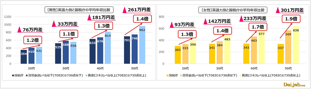 【Daijob.com独自調査】「英語力」で「年収」はどれだけ変わる?~50代女性で最大1.9倍(+301万円)の差が明らかに