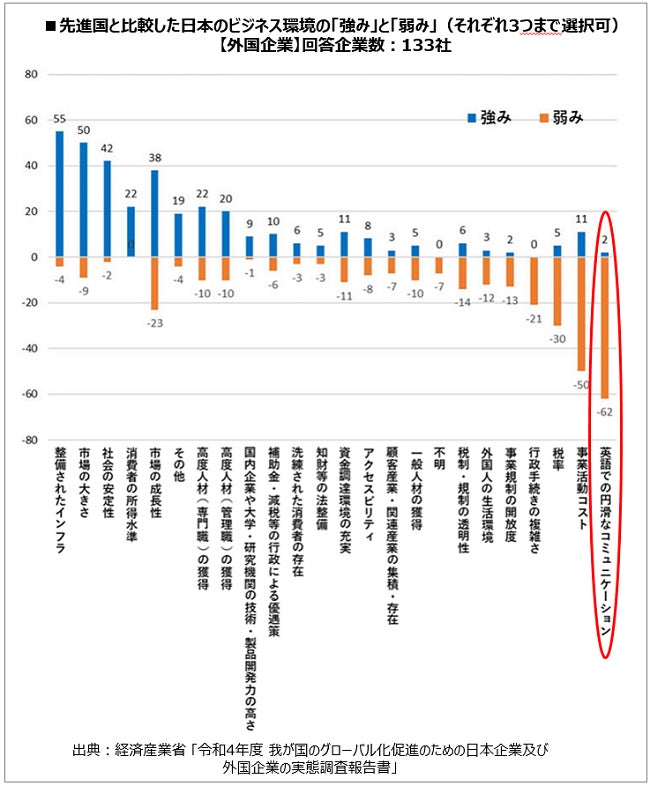 さらに、経済産業省が発表した報告書(※4)では、日本のビジネス環境における「弱み」として、先進国との比較で「英語での円滑なコミュニケーション」が最も多くあげられています。しかし、この「弱み」を克服し英語力を身に付けることで、日本のビジネスパーソンはグローバル市場で「強み」として評価される人材へと変化する可能性を秘めています。