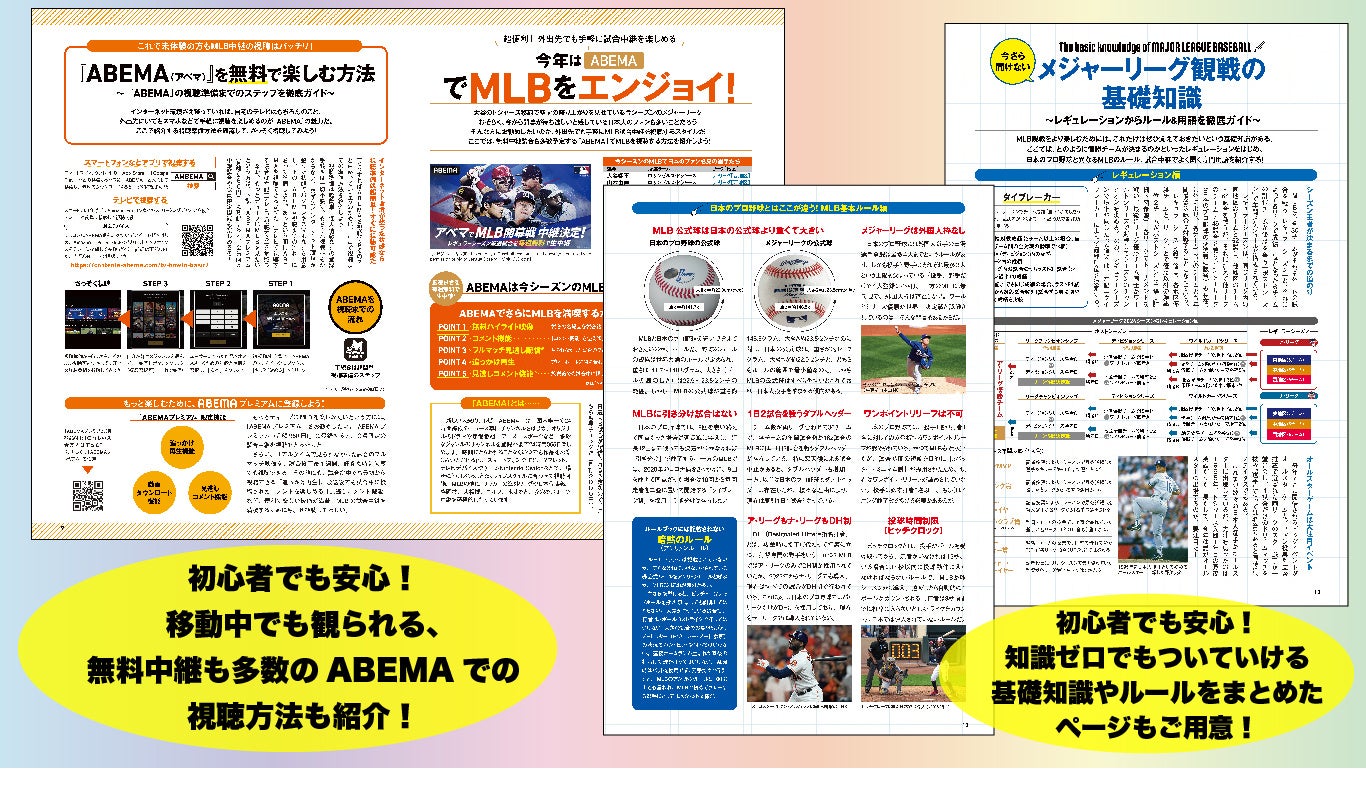 大谷選手が所属するドジャースを含む今シーズンの公式戦324試合を生中継する「ABEMA」では無料中継も多数予定されています。スマートフォン、PC、タブレットなどライフスタイルに合わせて、場所にとらわれずに生中継が楽しめます。本書では初心者でも安心して「ABEMA」を楽しめる解説付きなので、これまで以上にMLBを楽しめます。