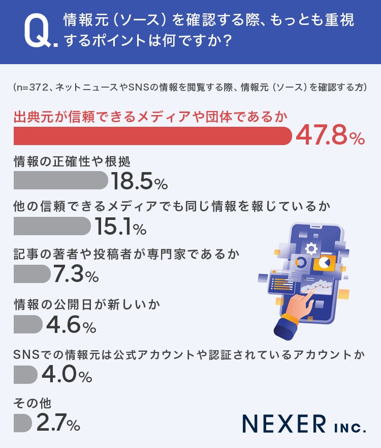 続いて、ネットニュースやSNSの情報を閲覧する際に「情報元(ソース)を確認する方」だと回答した方に、もっとも重視するポイントは何か聞いてみました。