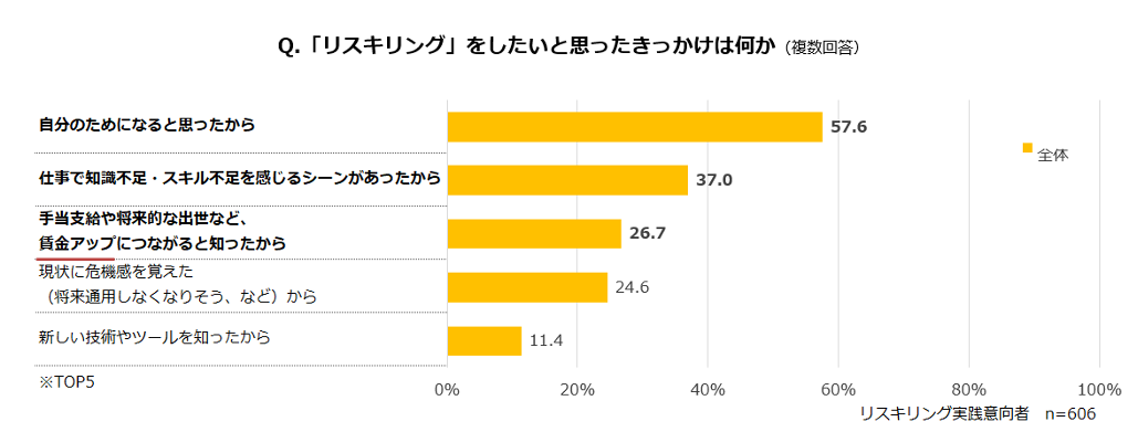 - リスキリングに興味を持ったきっかけは「自分のためになる」「知識不足を実感」「賃金アップにつながると知った」など【図5】