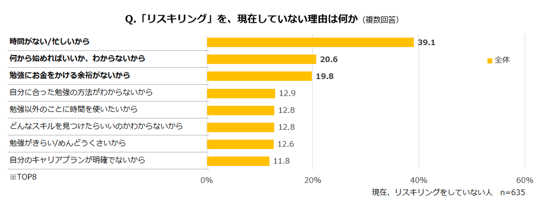 リスキリングを現在行っていない理由は、「時間がない/忙しい(39.1%)」や「何から始めればいいかわからない(20.6%)」、「勉強にお金をかける余裕がない(19.8%)」が多く、働きながら時間を確保することの難しさや、金銭的な負担が浮き彫りになった。【図7】