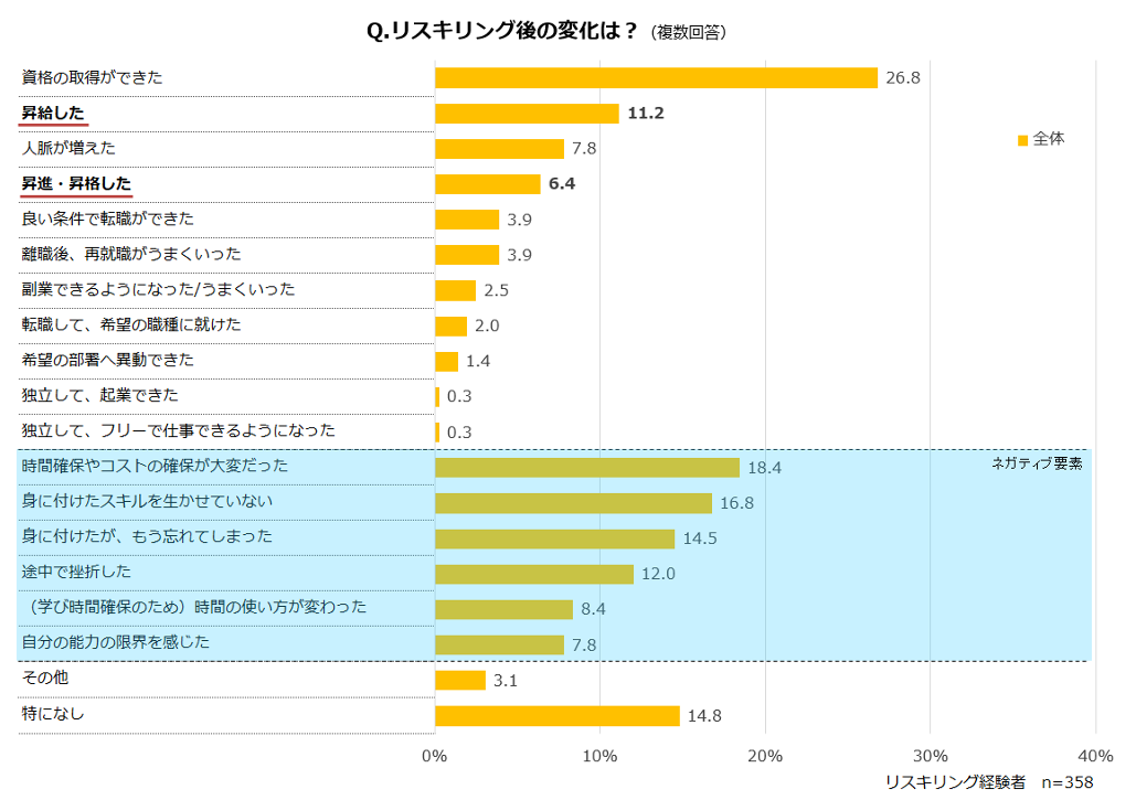 リスキリング経験者は全体の44.8%で、経験者が感じている効果は「資格の取得ができた」が最も多く26.8%だった。しかし、「昇給(11.2%)」「昇進・昇格(6.4%)」など、目に見える形や個人の評価につながっているケースは少数に留まり、リスキリングの期待と現実のギャップがうかがえる。【図3、4】