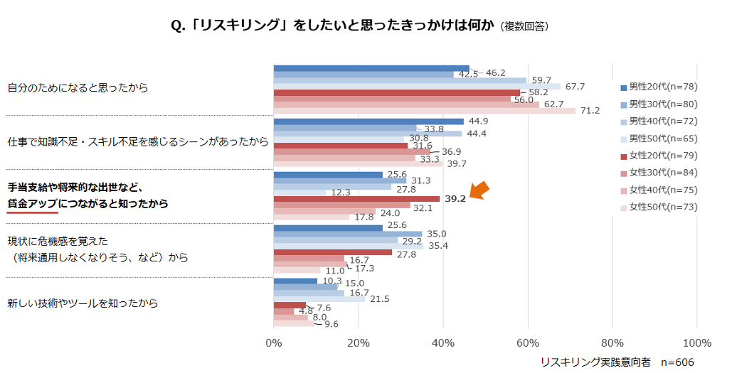 リスキリングに興味を持ったきっかけは「自分のためになると思ったから(57.6%)」が最も多く、次いで「仕事で知識不足・スキル不足を感じた(37.0%)」、「賃金アップにつながると知ったから(26.7%)」が挙がった。賃金アップの回答は20代女性では39.2%と4割近くに達し、賃金増への切実さを感じる結果となった。【図5、 6】